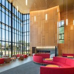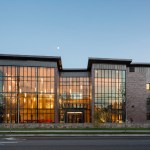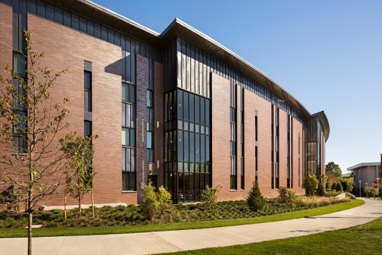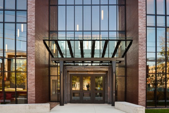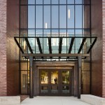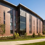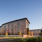 The building’s exterior continues the palette of the new College of Business across Jefferson Street. Both buildings use copper and iron-spot brick to bring a strong, common identity to the campus at its northern entrance. The glassy front displays the warmth and activity within, illustrating that the University is a friendly and exciting place.