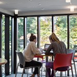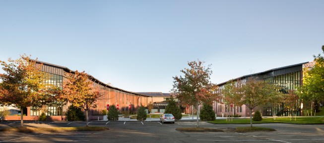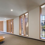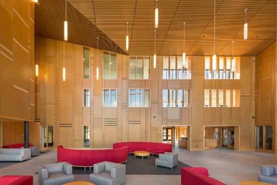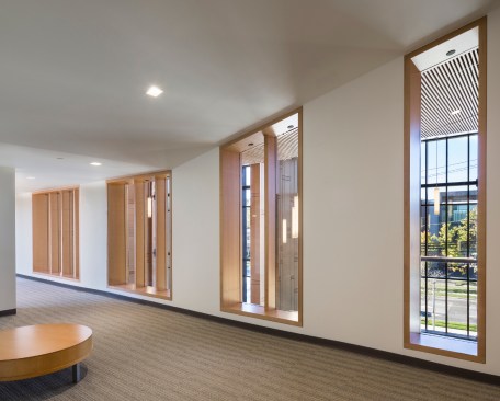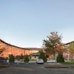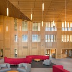 Two residential wings spread southward from the main entrances and public space to form a protected outdoor courtyard. At the end of each residential wing is a glass stair tower that faces toward the main campus to frame the space in light at night. A long glass-canopied porch entry at the opposite end also offers a warm glow and promises shelter in all weather. The courtyard’s lawn gently slopes southward, surrounded by gardens and bioswales, to make a warm sunny place even in winter.