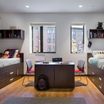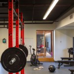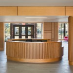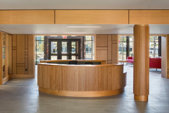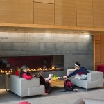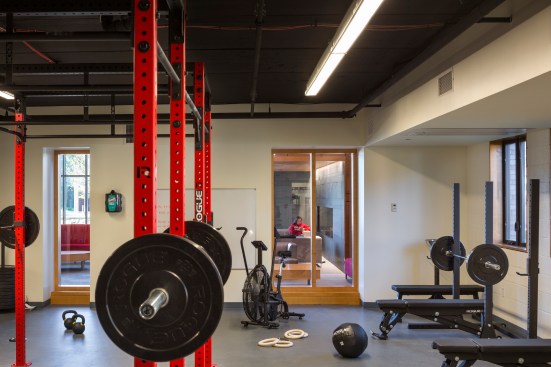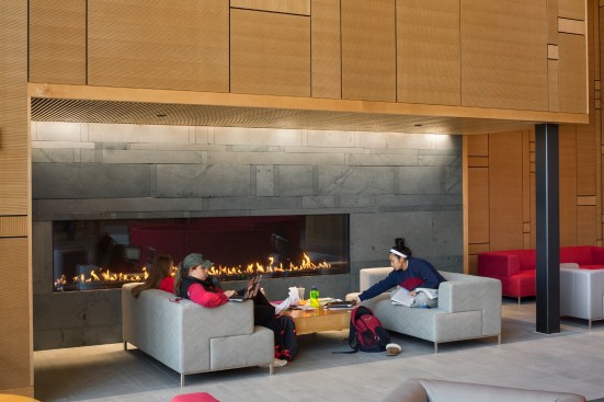 Students can gather in their local small lounges or in a dorm-wide commons on the first floor adjoining the building entries. This three-story space is paneled with maple and highlighted by a 12-foot-wide bluestone fireplace. The commons abuts a 1,400-square-foot fitness center, a state-of-the-art gaming room, and multi-purpose meeting and social rooms.