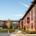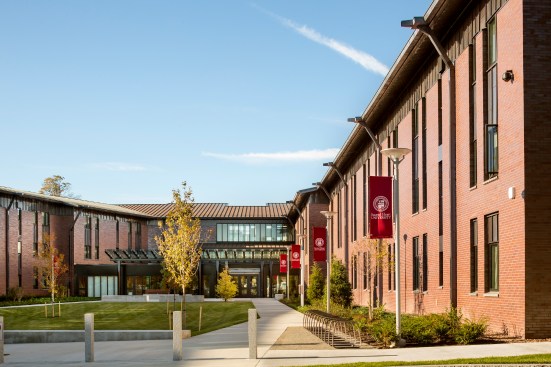 The Fairfield, Connecticut, campus’s 216-bed, 87,000-square-foot residence hall is named after Pope Francis, born Jorge Bergoglio. It is broken into “villages” consisting of small groupings of four-bed suites that share a neighborhood lounge and kitchen along with other amenities.