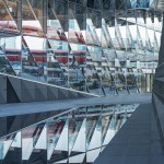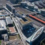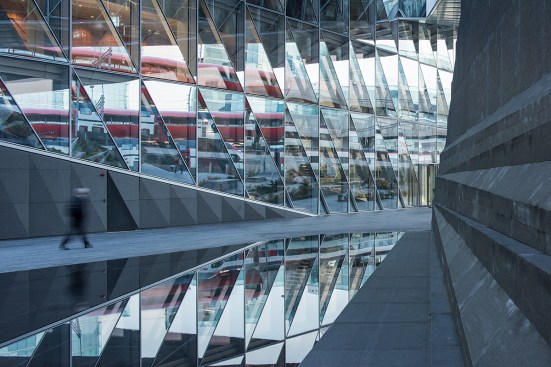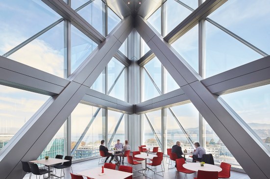 The building’s innovative Closed Cavity Façade (CCF) was designed in collaboration with Josef Gartner GmbH as a unitises a curtain wall system which responds to the demands of seasonally changing external climatic conditions whilst providing exceptional views out and maximising daylight penetration into the workspace. The floor-to-ceiling glazed panels measuring 3m wide x 4.2m high consist of triple glazing on the inner layer and single glazing on the outer, forming a cavity with a fabric roller blind in between. The panels are sealed and equipped with a pressurised supply of filtered and dehumidified air which prevents condensation and heat build-up inside the cavity. The CCF system prioritises occupant comfort and reduces the whole building’s energy demand and carbon emissions, helping it to meet the requirements of European Energy Directives and the Swiss Minergie sustainability rating. The system represents one of the best performing all glass façade systems in SOM’s history.