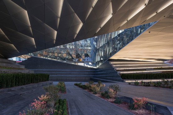 The architecture draws references not only from its immediate context, but also Lake Geneva and the Alps, establishing a strong identity amongst its illustrious neighbours while responding sensitively to its low-rise context. The building’s form was dictated by the shape of the challenging triangular site and the necessity to maximise useable space. By elevating the north eastern and southern corners of the building, a public courtyard is carved out, creating permeability through the site, opening it up to the local neighbourhood and facilitating direct pedestrian connections to a local transport hub. The impressive cantilevered space and clear-spans of up to 60m and 75m respectively, provide the building with its unique elevations and also create a unique sense of arrival for employees and visitors.