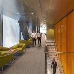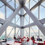 The interior design concept maximises both vertical and horizontal interconnectivity, achieving the client’s desire to create a social and collaborative community space for its 1,000+ employees. SOM developed tailor-made workplace models for use throughout JTI’s headquarter space and the firm were able to break down corporate silos and contribute to the creation of a seamless workplace network, providing long-term flexibility to accommodate JTI’s evolving needs. The open-plan space was achieved using an innovative engineering design solution; a peripheral torsional tube structural steel system allowing for column-free floor plates spanning 18 metres.