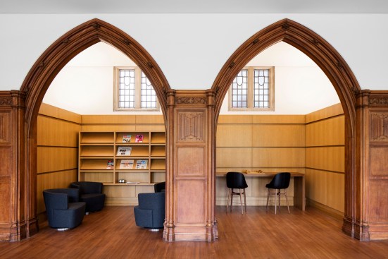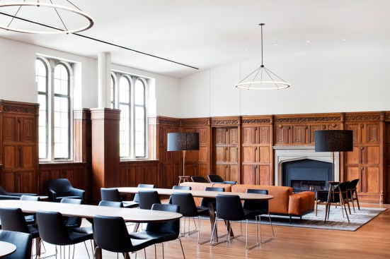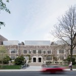 The building is located in the north-east precinct of the campus and occupies a prominent position east of Washington Road on Scudder Plaza – on the seam where the historic west campus meets the more contemporary east campus. The campus pedestrian pathway system was extended into this precinct as part of the landscape design, and a new south atrium and bridge entrance to the Simpson Building directly connects to Scudder Plaza. On Washington Road, the Beatrix Farrand landscape has been restored and forms the entrance court to the JRR Building. New glazed rooftop pavilions complement the heritage façade, and deliver flexible meeting and seminar rooms with remarkable views to the historic campus to the west.