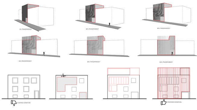 We challenged ourselves to design the screen such that it was performative and multivalent in its function rather than merely a tack on. We employed the derivative techniques associated with parametric design as a direct response to our desire to capture a sense of movement. A topographic relief of varying depths was applied to the vertical fins, creating alternating fields of opacity and transparency when viewed from different angles, putting the screen in a constant state of flux. This ‘effect’ facilitates a dialogue between the street and the users of the building. In addition to its sculptural and temporal qualities, the screen performs in the following ways: