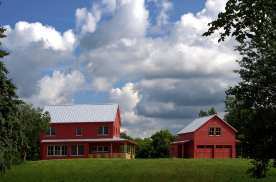 The project is built on a rural property in Oakland County Michigan in the location of a previous farmhouse that has long since been removed. This 21st century farmhouse pays homage to its predecessor in many ways, not least of which is its capacity for self-sufficiency. The 2,000 square-foot, single-family residence with detached garage and apartment is sited in a beautiful setting of rolling fields and forests. The site’s topography and orientation allow for excellent solar exposure aligned with picturesque views of the property including a pond to the south and a lake in the distance to the north. While the house siting allows for passive solar gain, the relatively cloudy skies of a Michigan winter require a balanced approach to the home’s passive solar strategy.