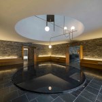 Programmatically, the cultural center provides a number of luxurious and spacious amenities for its members. It includes a 100-person multi-purpose hall for events, a spacious business lounge and bar, a feature library, children’s reading room, private function room, family media room, a red-wine and cigar lounge bar and a rooftop deck. Part of the cultural center is functioning as a sales center. A double-height reception welcomes potential buyers to embark on a journey through the media room, winter garden, then upstairs across a bridge over the courtyard to a generous sales presentation lounge complete with VIP rooms, bar and children’s playroom. One of the most prominent spaces in the clubhouse is an art gallery, equipped with a series of hanging moveable walls for a flexible display system. The sculpted ceiling above gives some visual connection to the upper level, while a large glass picture window allows the space to extend into the courtyard. On the second floor, a generous yet inviting private dining room complete with a bar and show-kitchen allows members to rent out the space for special functions. The red-wine and cigar lounge bar and rooftop deck on the third floor has an uninterrupted view of the surrounding mountainous landscape to west. space comes alive with the many different geometric cuts carved out to interact with the sky and daylight such that each space is ever-changing when light is reflected off of the rich texture of Venetian plaster. The layering of customized furniture, refined brass metal detail, natural veins of stone accents, softness of fabric, and delicate lighting elements work together to compose a sense of understated luxury.