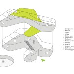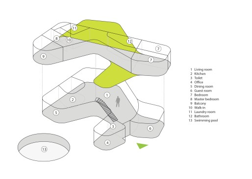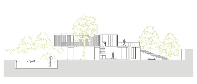 The car park and service area occupy the lowest part of the plot, leaving a generous platform on top for the piano-mobile of the house. This level is arranged as an open-plan space that wraps the landscape around it. In its northern end, the massing offers a welcoming gesture to mark the main entrance, at the front, it encloses an intimate courtyard towards the swimming pool, and at the back, the living room faces a private garden.