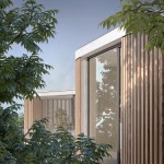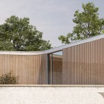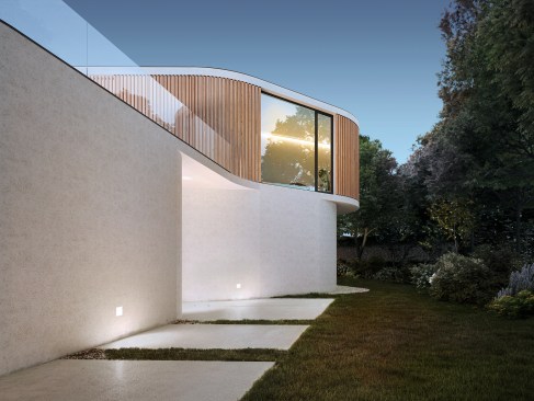 The facade of the house features large floor-to-ceiling windows between the curved white-rendered walls, while the upper floor is wrapped with a series of delicate wooden slats. This permeable skin becomes a protective layer to provide privacy to the master bedroom while its materiality highlights the curved contours of the flat roof.