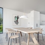 The formal language of the house is also used in the interior design of the fixed furniture. The kitchen is configured as an independent island with rounded corners and white finishes. The ceramic tiling of concave pieces without joints creates a pattern of vertical lines that resembles the slats of the facade.