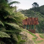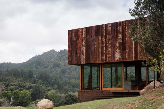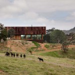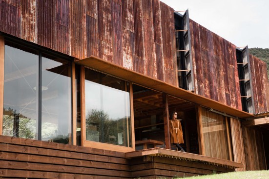 Our response was to concentrate the small mass of building that the brief determined into a singular geometric form that could hold its own in the big landscape. We positioned the form straddling the ridgeline, engaged with the slope at the high end and floating above the land as it falls away. Drawing from the vernacular of rusty corrugated iron sheds prevalent in the district, we clad the form in a rainscreen of rusted corrugated iron sheets, a rural camouflage of sorts.