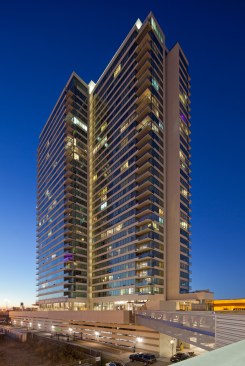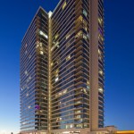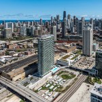 The unique plan of the residential complex resulted from minimizing the bulk of the building while maximizing the density permitted by the underlying zoning for the site. The sleek, contemporary form of the tower is expressed in an elegant balance of horizontal and vertical concrete and glass elements. The two wings of the structure “slide” past each other capturing the core elements between and allowing natural light to flood interior spaces. The building sits atop a 3-story podium that contains 16,000 square feet of parking, service and amenity spaces and also serves to raise the entry court up to the level of the adjoining street to enhance pedestrian circulation. The two-story entrance and lobby features a dramatic floor-to-ceiling window wall that showcases panoramic views of Chicago’s Loop.