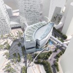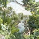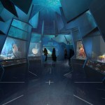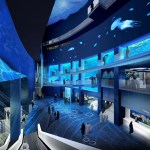 The plan captures the energy and dynamics of ocean currents as the geometry of the floor plates sweeps on both sides of the building, containing a central Grand Hall and creating a fluid sense of place for the experience. Visitors come to a central ticketing lobby and move upwards in dramatic fashion on glass elevators bringing them to the top of the building and the terrestrial habitat. From here, the visitor travels downward into the various living exhibits, crossing from one exhibit to another through the central space between the “currents.”