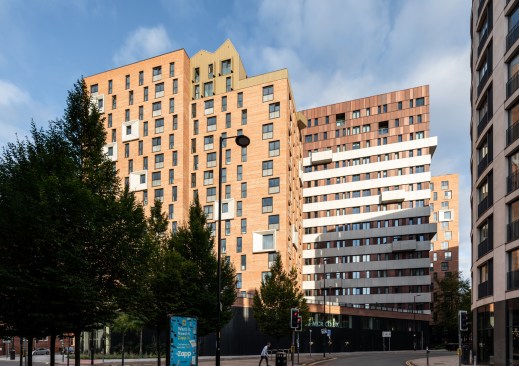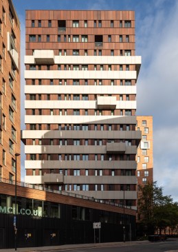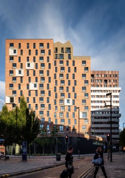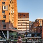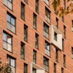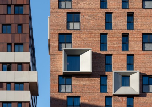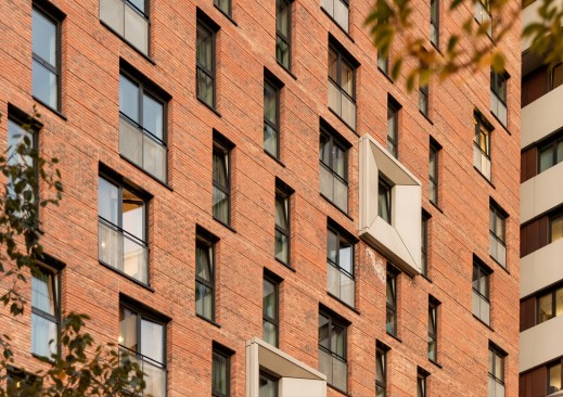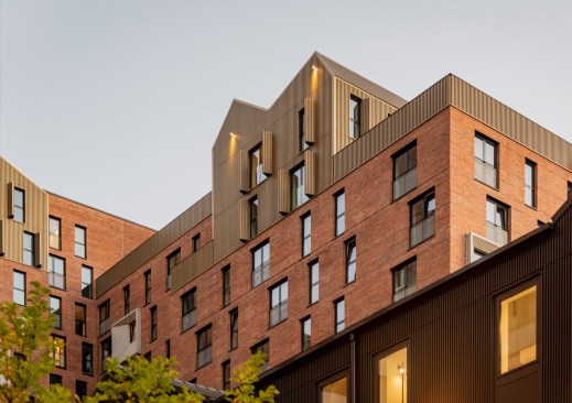 The architecture expresses the individual building blocks with variations in height to make each facade legible. The alternating positions of accentuated apertures in the facade work to reduce the scale of the brick mass while the light pixel elements add relief and balance to the facades.The buildings are horizontally divided into three distinct elements: a podium with dark profiled metal cladding, a mid-section with rough-textured red brickwork, and a roofscape characterised by Dutch houses also clad in profiled metal.