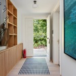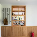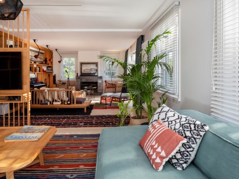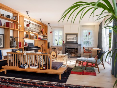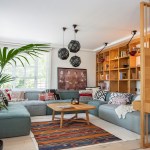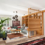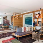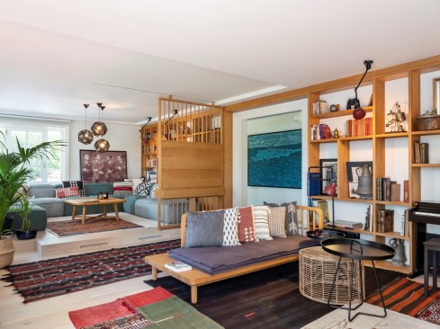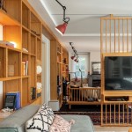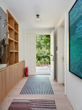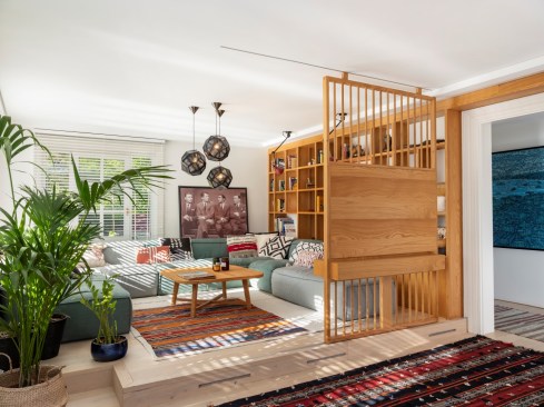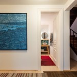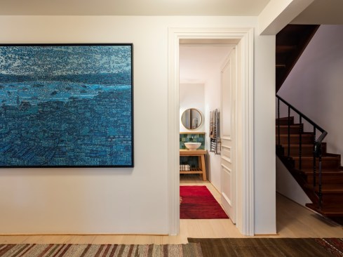The shelving system creates a window between the seating area and the entrance hall, connecting the two spaces and bringing light to the corridor. The mosaic tiles in the entrance imitate the kilims placed all around for a pleasant feeling for the naked feet. A huge Devrim Erbil painting of Istanbul panorama takes its place in this hall.