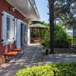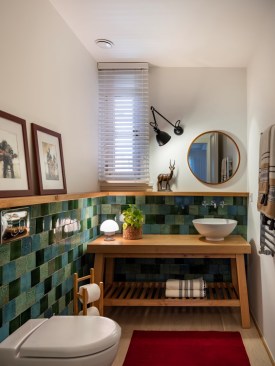 With little need of storage the bedroom is designed spacious. The bathroom and the wc walls are covered with handmade ceramic tiles, with the oak parquet flooring used all around the house, and with kilims accompanied.