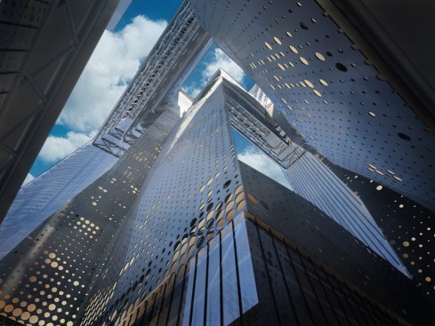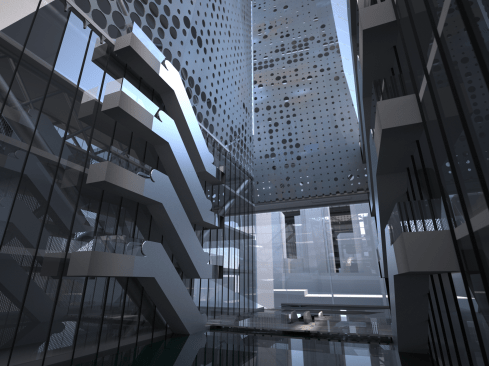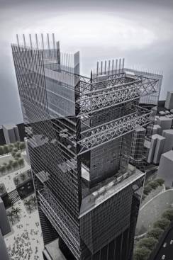 The building plan takes a radical approach. Rather than piercing the core through the middle of the building, we place the vertical circulation at the perimeter and opened the 280-meter tall atrium to the sky. To further enhance the experience of the atrium, the apertures produce opportunities for light to fill the space and frame captivating views of the Chongqing skyline.