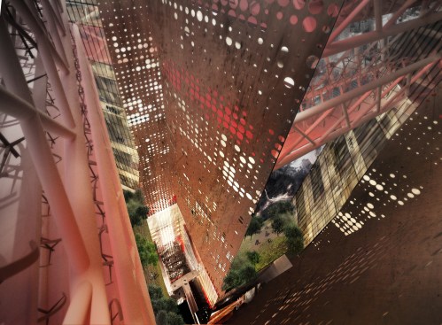 The “L” shaped building core is skinned with an abstracted foil inspired by the topographical conditions of the surrounding mountains and the indigenous housing overlooking the river. This creates a rare ever-changing experience for visitors, office workers and hotel guests as they make their way along the exterior walkways and experience the light, views, and meaning of the foil.