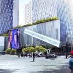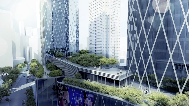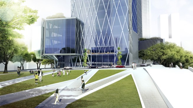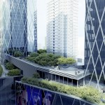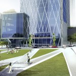 The city grids are translated into the diagrid fenestration of the buildings becoming a three dimensional representation of the city.