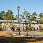 The complex of four buildings was conceived as a pedestrian village within woodland, organized around a central court and wood cloister. This maintains Duke’s identity as a “university in the forest,” as it concentrates built development to optimize the surrounding woods to be a sustainable and continuous matrix of flora and fauna. Broken into courts and pavilions, the place has a human scale, comfortably serving both large and small groups.