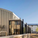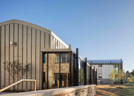 The surrounding terraces of bluestone at the entry and arcades are flush with interior floors for accessibility. This is made feasible by hidden ground gutters below the stone that also collect run-off from arcade roofs and the central court. Site storm water drains to a campus-wide bio-pond where it is cleaned before returning to nature.