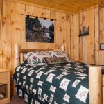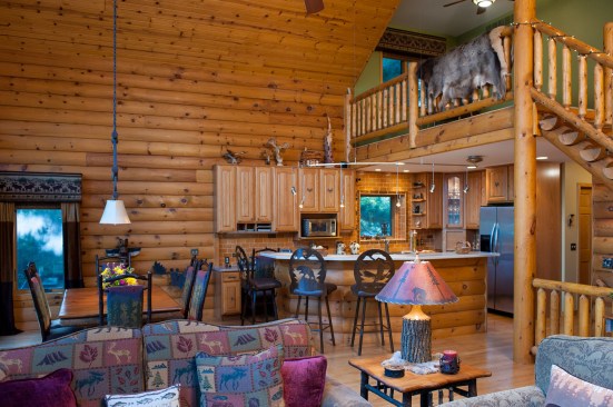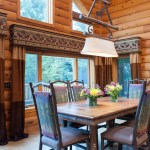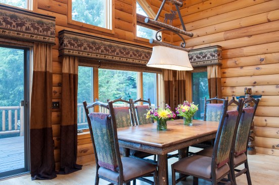 In order to embrace the mountainous influences of the surrounding timberland area, Michelle created a custom-made, wooden table with tree-trunk legs yet with a smooth, refined top for the dining room. This complemented the finished log wood on the walls, cabinets and staircase, making for a coordinated and central-themed cabin full of picturesque rustic charm.