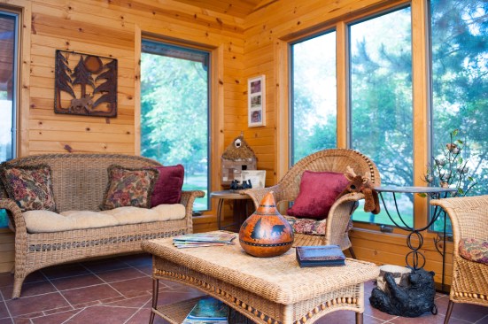 A stack-stone fireplace with a pine-garland décor element draped over the mantel stabilizes the room and sets the perfect ambiance for friendly conversation with friends. Knowing that the Kasprzyks love to read, Michelle also designed a soothing sun room with comfortable, wicker furniture as a little, home-style nook for quiet time as well as get-togethers.
