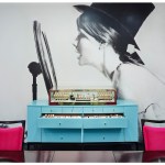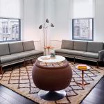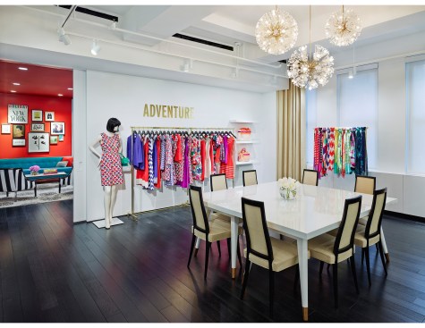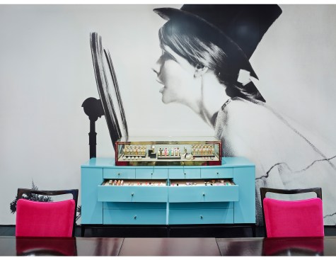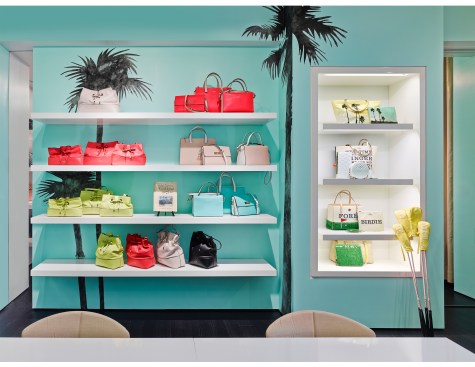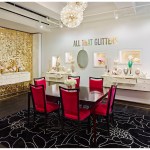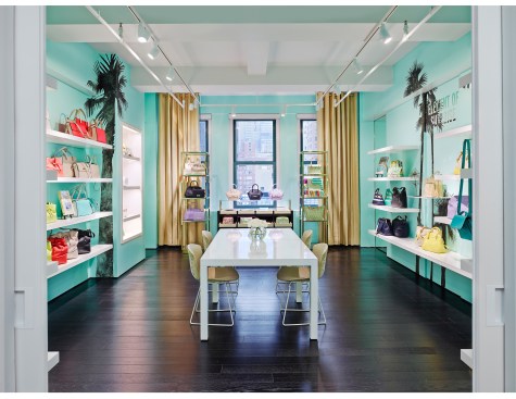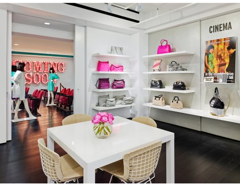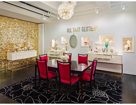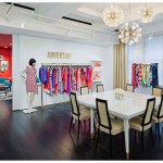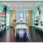 In the Kate Spade showroom, a spirit of travel and adventure is heightened through the use of textiles and graphics. Lavender, turquoise, and lime green live harmoniously with bold black and white stripes and shimmering gold, perfectly pairing sweetness and whimsy with high fashion and sophistication.