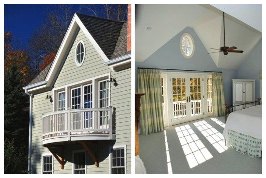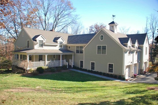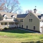 The addition was designed to match the existing house, with carriage style garage doors and barn light style fixtures above each door. Green design principles include the use of spray foam insulation and low maintenance materials such as fiber cement siding & PVC trim.