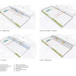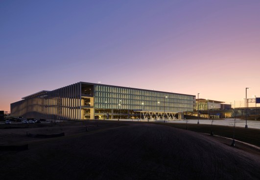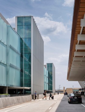 The goals for this project included providing a quality passenger experience, initiating clear intuitive wayfinding, representing Kansas City and regional identity, and creating convenient access to multiple modes of transportation. The parking garage establishes the initial view of the new KCI Airport visible from I-29 highway, and provides 6,219 parking stalls to accommodate visitors. Vehicular speed ramps to all levels of the garage are stacked to the far eastern façade away from the terminal, allowing for safer pedestrian use as visitors move from west to east through the garage toward the terminal entrance. Features such as electric vehicle charging stations, ease of access to multiple modes of transport, and a smart parking guidance system seek to improve user experience within the garage.