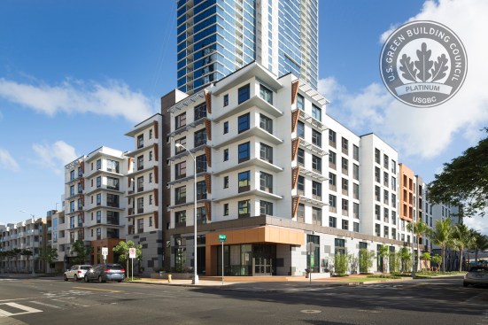The Keauhou Lane Mixed-use Development project is a 6-story affordable rental mixed-use housing project with five levels of residences over 30,000 SF of street level commercial retail space completed in the summer of 2017. As a collaborative piece of an overall master planned development, the Keauhou Lane Mixed-use Development project is the first truly integrated Transit Oriented Development project delivered to the Honolulu Market place. With a firm history rooted in sustainability and substantial experience with very complicated mixed use multifamily design, collaborative efforts by both the design and development teams resulted in an affordable, sustainable, and holistically connected LEED Platinum Certified project. DWELLING UNITS: 209 / BUILDING AREA: 179,181 S.F. / LOT AREA: 1.57 ACRES