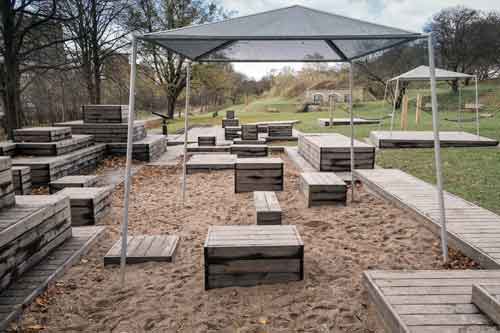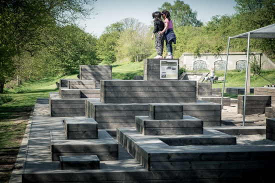 The VEGA Park and playground project sits in one corner of the 10km wedge of outdoor space in Denmark’s capital, for families to explore, play and learn about the area’s history. The park experience is designed so that visitors can imagine how life was for soldiers; the tribulations of daily life and the manually and physically challenging chores they had to complete to maintain the integrity of the armouries. The playground is also themed to include features specific to the region, for example the light ‘pavillons’ are interpretations of the former tent structures used for camping on the ramparts when having training sessions. One of the original look-out points has been restored, which once provided important military vantage point and now encourages visitors to scale the steep slope, exploring the whole park.