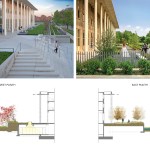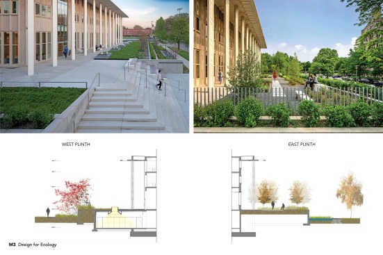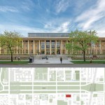 The decorative limestone building with a five-foot tall imposing plinth was in need of full restoration; social repair to the adjacent underserved neighborhood, which the original building turned its back to, was also needed. One north-facing entry was replaced with new welcoming paths that erode the plinth, inviting passage on all sides. Encircling rain gardens soften pedestrian experience with sculptures, seating, and other architecturally significant pieces salvaged from the original building. Patterned bird-safe glazing wraps the rooftop addition and opens the façade at key locations, inviting passage through the building.