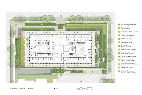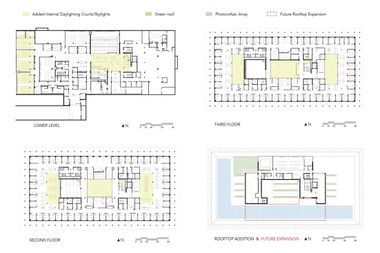 The expansive concrete structure had restrictive floor heights and offered little connection to the exterior. Extensive daylight analyses helped balance perimeter windows with daylighting in the east and west two-story atria. A larger central four-story atrium was carved into the building and serves multiple programmatic functions.