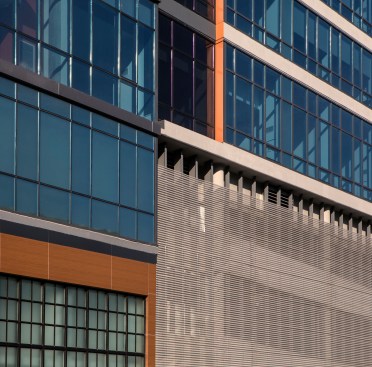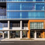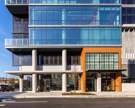 This modern residential complex consists of a high-rise fronted by a triangular shaped low-rise. The first floor includes 14,000 sq. ft. of commercial space between the two sites and the high-rise includes garage parking. A new pedestrian-friendly street with corner retail at both ends bifurcates the site. The residential lobbies for the two buildings align mid-block to ease access to the shared amenities which include a rooftop pool deck, two large interior amenity spaces, and a roof deck surrounded by plantings and vegetation. The fenestration includes a cleanly detailed rain screen system, natural-finish materials, a variety of modernist window configurations, and recessed balconies painted with a striking accent color. The west facing garage incorporates a vertical green wall to screen the views of the garage from the adjacent residential projects.