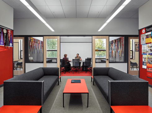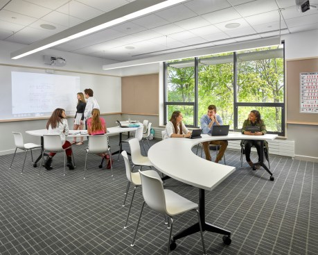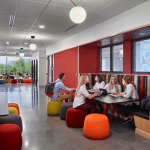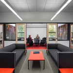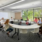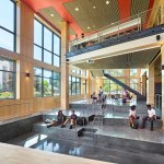 Throughout the building, the theme continues: every space works to capture the most potential for collegiality, student-teacher interaction, and cross-pollination between disciplines, resulting in a collaborative and supportive environment for the entire school community. Inside the classrooms, seamless and unobtrusive technology supports varying teaching techniques, and flexible furniture can form multiple configurations to accommodate different needs. Faculty and administrative areas are clustered to allow shared amenities and to make them more accessible to students. The Forum, an expansive double-height atrium, was designed to maintain a constant flow of circulation and activity. It was designed for lectures and events as well as an informal gathering and study space. The building’s corridors are populated with informal breakout spaces outfitted with comfortable seating in fun colors where students can work or socialize outside of class.