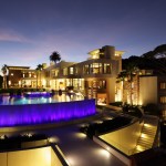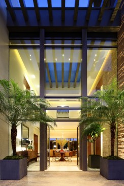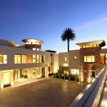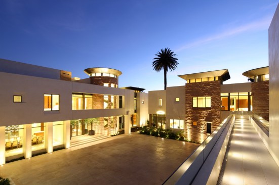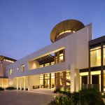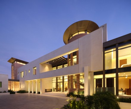 The exterior includes large stucco solids that yield to dramatic framed openings. Vertical elements are clad in chiseled sandstone and capped with metal eaves. These solids are punctured by large glass walls that create a transparency from the outside to the inside, flooding the house with light. The juxtaposition of solid and void create a playful, elegant rhythm.