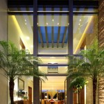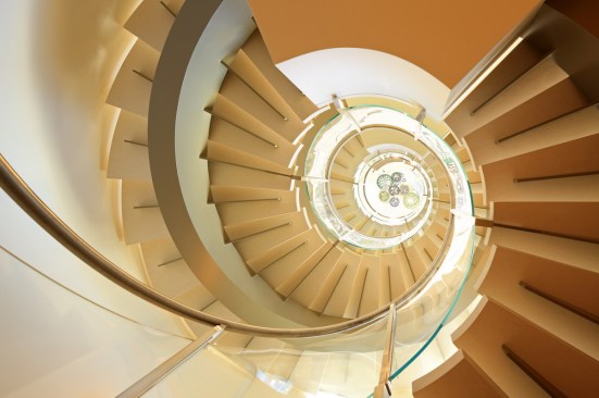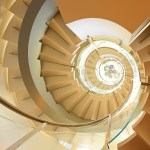 Then drama of the exterior is echoed inside—the helical stairway with floating stone treads represents a sculptural element that is seen on all floors. Warm wood veneers and exotic stone accents are highlighted against the simple soft limestone floor and white plaster interior. This combination creates a warm and comfortable feeling in the clean, modern spaces.