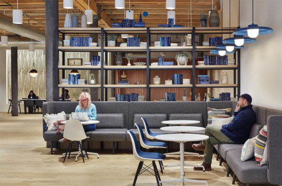 This dynamic office lobby is now a hub for the building and neighborhood.
