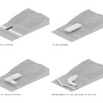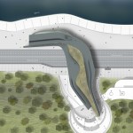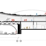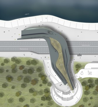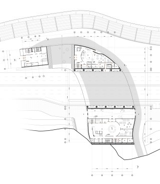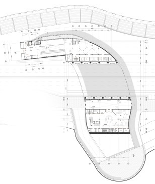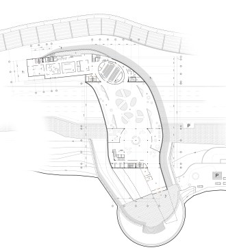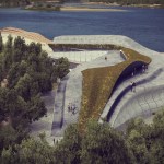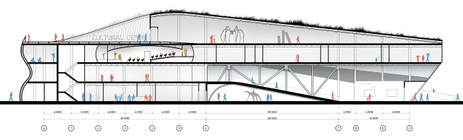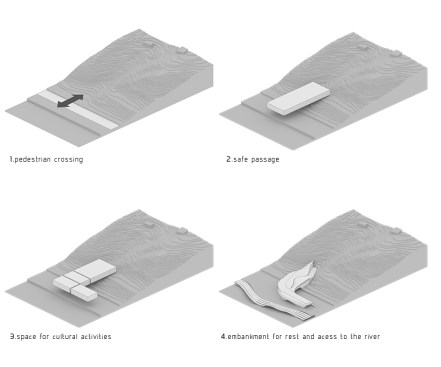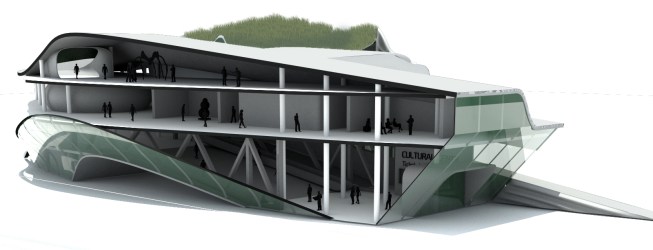 A major factor of the design is the site and the building as site. The building is a fluid extension of the ground from which it grows. Moreover, it grows- in part. A dual layer is created as a walkway of one side of road to the city quay that is cutted out of pedestrian pass, enabling visitors to walk over the building as well as through it.