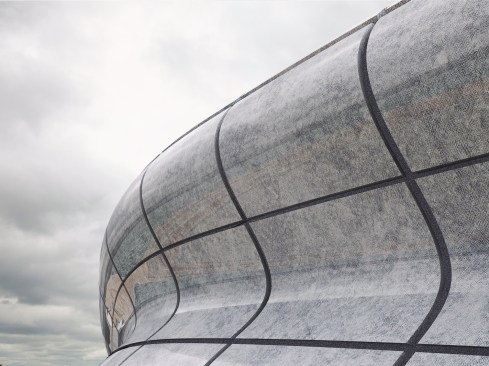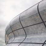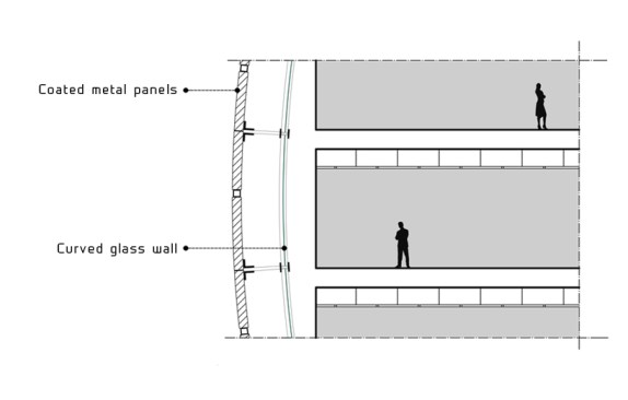 The basic material of the manufacturing process was a series of flat panes of 15mm thick metal. Moulds were made out of steel rods contoured to the precise double-curved shape of each panel. Then a 10mm thick glass pane was made pliable with heat and laid over the contoured bed as an underlay to smooth out bumps and imperfections. Each panel was unique in its sculptural form.