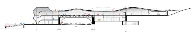 A simple and organic gesture creates a topographic form that blends into landscape making a fluid and natural relationship between inside and outside – people move over as well as through the building.