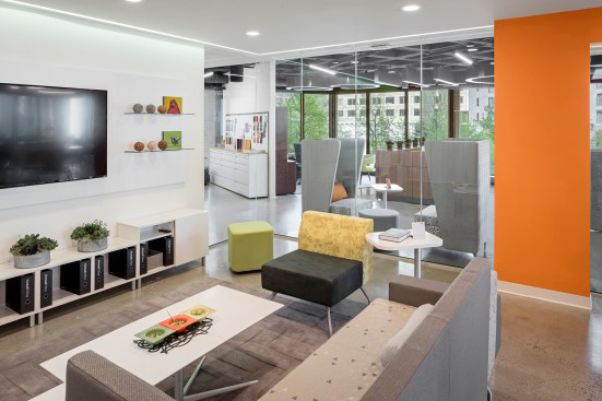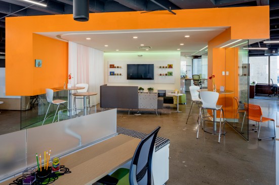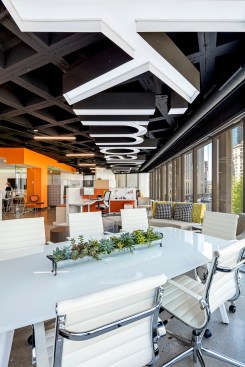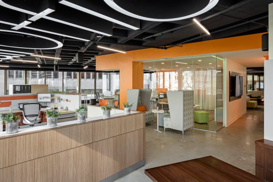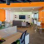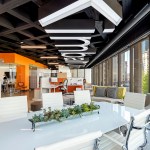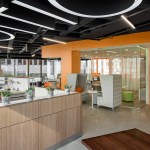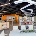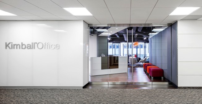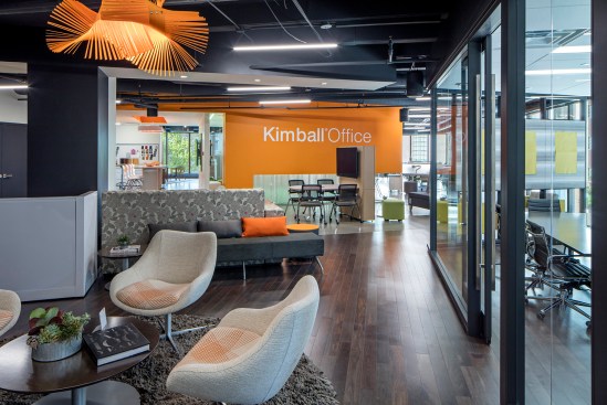 Along with the dynamic ceiling lighting, the new showroom consists of an open floor plan to view many of the fine products that Kimball Office has to offer, a “pavilion in the space” for informal meetings and creative activities, and walls orange in color to give the feel of enthusiasm, joy, and success. We designed the space to be flexible and ready for future trends in the office furniture industry.