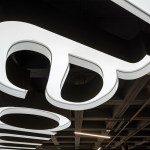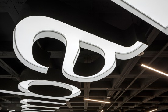 As great as that 3rd floor location was, there needed to be some enticement to get people up there. Kimball’s team wanted their clients, designers and potential customers to know “Kimball Office is here!” However, a dilemma was presented when the building’s landlord told us that there would be no signage allowed on the façade. After a few walks outside, we realized that we could see the ceiling in that 3rd floor space from most locations in the park…We knew right away that this was where we could make our statement.