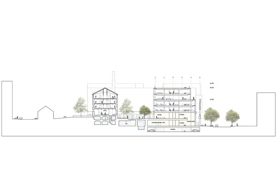 Outdoor spaces such as terraces and roof gardens allow access to the outdoors from all levels and bring users of the building closer to nature. In addition, the new design turns the Brewery Kimmel's former industrial backyard into a vibrant plaza revitalized with a new surface made of more recycled bricks, lush landscaping, brick and timber benches, and mirroring water elements fed with water from the roofs.