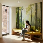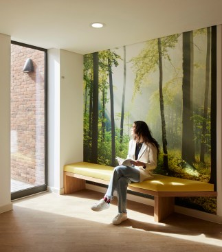 Due to the restful nature of their treatment, patients are encouraged to spend time in their bedrooms. As a result, they have been designed to be a comfortable space for relaxation and reflection. Bay windows provide a place to sit and enjoy the surrounding trees, whilst allowing light deep into the room. The layout of the bedrooms, and the ward plan with a central staff base, allows observation to be maintained with efficient staffing levels, without patients feeling that their privacy has been compromised. Natural materials, neutral colours and integrated artworks throughout the building, complement the ever-present views to nature.
