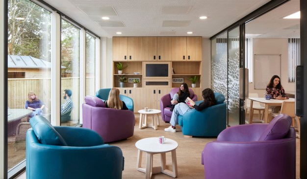 An attractive and homely Activities of Daily Living kitchen allows patients to practise meal preparation and cooking in an environment that mirrors everyday life, providing the confidence to complete these tasks independently. Group therapy spaces are immediately accessible from the dining space to enable workshops to take place, in which feelings about eating are shared and explored. Sliding doors allow these key shared spaces to be opened-up to promote social connection, or separated for more private, focused activity. Large areas of glazing provide expansive views from the lounge and the activity room to the private, therapeutic garden.