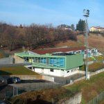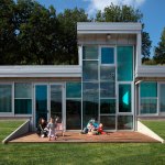 to satisfy the daily needs of the students and faculty energy is captured through natural resources. the glass openings, used for the length of the facade permit the sun to filter through the space during different times of the day and to heat the rooms inside. heat is also captured through geothermal probes which are placed inside the bulkheads to trigger an exchange between the ground and thermal pump; and through photovoltaic panels that are positioned in a compartment on top of the copper roof. rainwater is collected in a special tank and reused for irrigation and for the sewage in the restrooms.