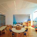 the program consists of four classrooms to support 60 children with an exterior raised vegetable garden to create protected spaces for the children. the green deck ensures an interior comfort level which is maintained through thermal insulation. to preserve the environmental landscape, terrain is place on top of the roof’s wood structure. the system reduces the visual impact of the structure on the site as is carves itself the hill.