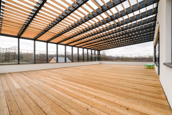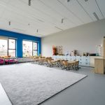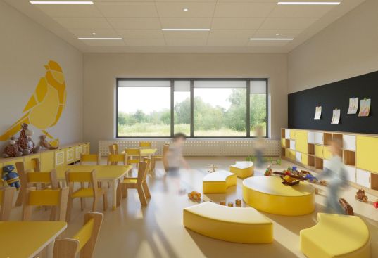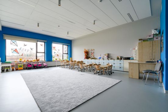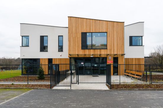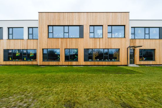 Photo credits: Tremend Kindergarten in Wilanów district of the city of Warsaw, was designed for 250 children. Structure was adapted to the surrounding landscape and low-rise buildings. Architects had to put all the necessary functions for a small kindergarten on a limited narrow plot, which is why the outdoor area with a playground was a big challenge. All this has been achieved while maintaining a large, more than 70% of soft landscaped area. Working with a building structure on a narrow plot was like playing with toy wooden blocks, when imagination and creativity is stimulated. Typical set of several wooden blocks allowed us to arranging many combinations and find the best fitting building shape that looks more compact. The project assumes breaking the block building into several smaller parts, which have been slightly shifted in a row with each other. Thanks to this, we managed to maximally use a narrow and long plot. An additional advantage is the wood claddings. Wooden façade warms the building and refers to the local Nature Reserve. The two-storey building was fully adapted for the disabled kids. The kindergarten was adapted to the needs of the youngest users through a clear functional layout. Rooms for learning and playing, bathrooms, changing rooms, catering and administrative facilities as well as technical rooms are in thematic blocks, moreover, different functional zones have been distinguished into zones by means of vivid wall colours and nature graphics. Each room has been individually treated with the appropriate choice of colours and design. The project appeared colourful street art referring to nature and birds. On the second floor, there is also a place for a recreational spacious terrace, used for recreation, which allows to view the edge of the forest of a nature reserve. Wooden floors and openwork beams supporting the glass roof partially protect from excessive sun, and at the same time brings natural light. Thanks to this, in this space there is a warm atmosphere conducive to learning and playing. High, thick-walled railings were designed to provide children with safety. This treatment enabled the opening of the terrace to the surrounding landscapes, and thus the penetration of green into the interior. A combination of wood, many glazings, a simple harmonious shape and a clear layout give this building a timeless character.